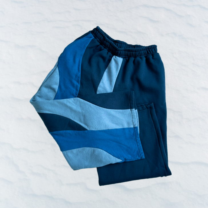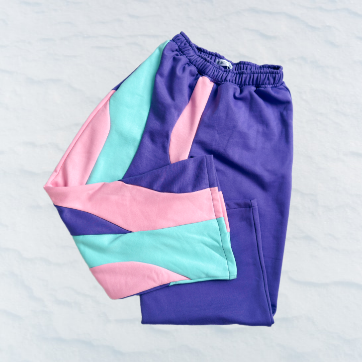 Buzo unisex de corte relajado, con detalles curvos en distintos colores. Cintura elástica y bolsillos laterales.